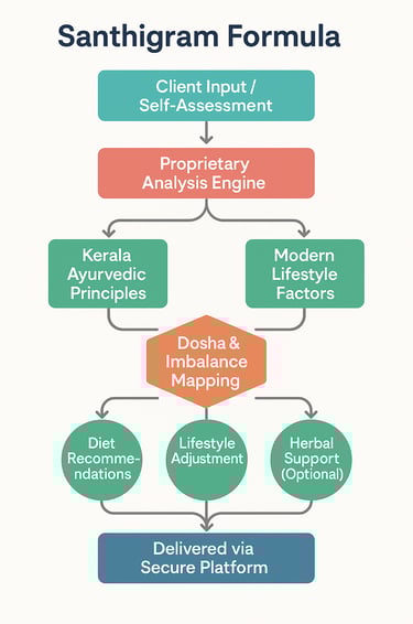 THE SANTHIGRAM Formula™, created by renowned Ayurvedic authority Dr. Ambika Nair and a team of expert Ayurvedic physicians, translates deep Ayurvedic intelligence into an actionable plan tailored to your specific body type, imbalances, and modern lifestyle.
